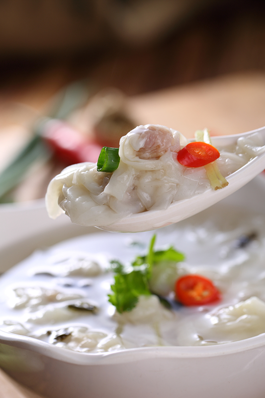 馄饨馅料由虾肉、干贝和肉馅组成